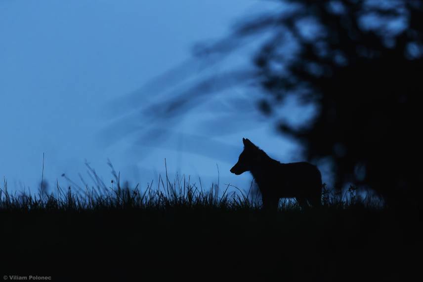 Keďže na kalisko chodilo v noci množstvo diviakov, na kontrolu som išiel radšej po dvoch týždňoch, aby sa nestalo, že sa vybijú baterky a fotopasca nebude snímať. Bolo kúsok pred zotmením a cestou od fotopasce som zažil aj krásny zážitok. Kráčal som popri lese a v diaľke som zbadal siluetu vĺčaťa. Čupol som si ku kríkom, aby ma nezbadalo a počkal som, kým zájde do lesa. Na pamiatku som si zhotovil aj jeden záber.